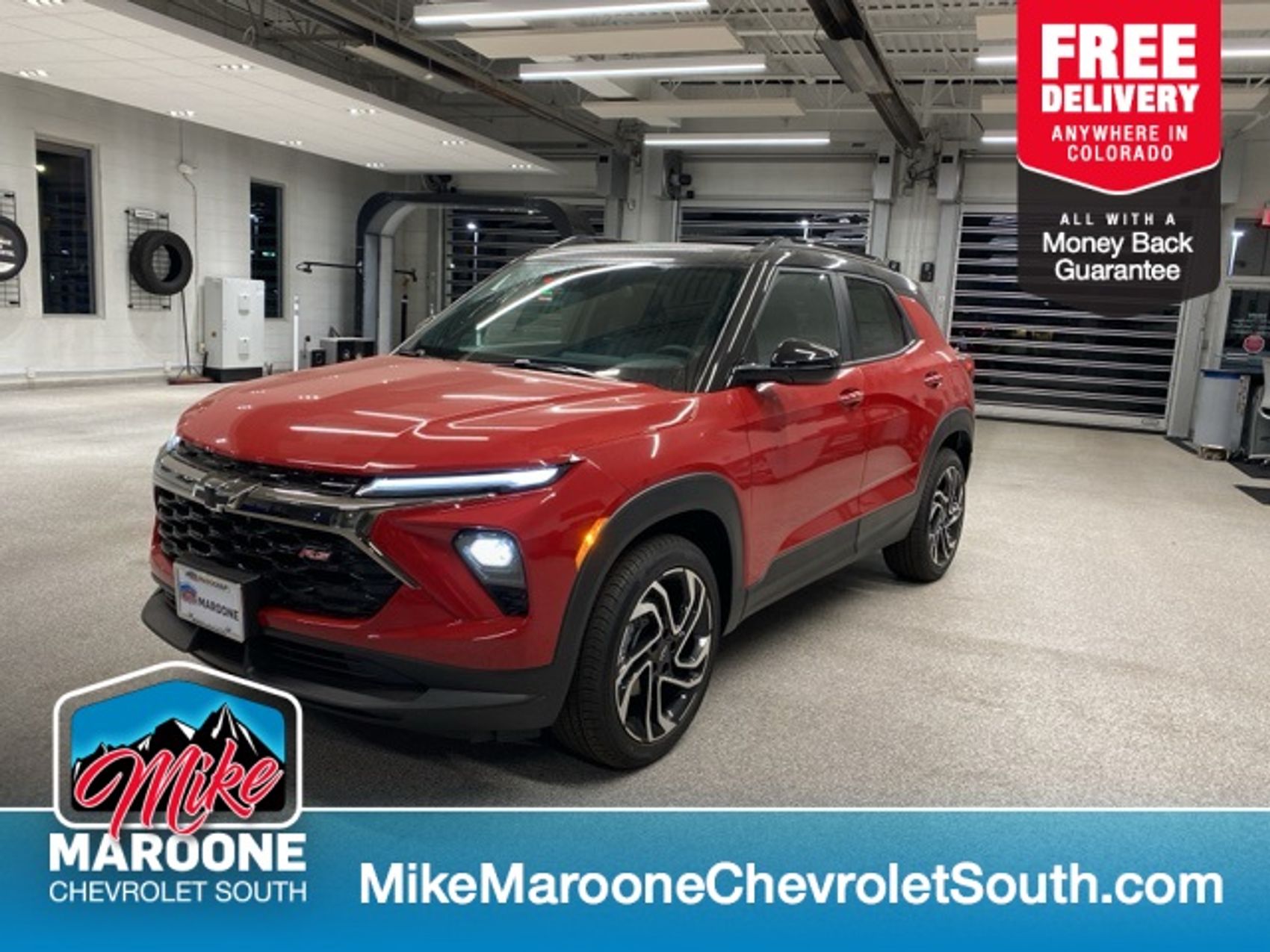 2026 Chevrolet TrailBlazer RS AWD 9-Speed Automatic 1.3L Ecotec Turbo DOHC SIDI w/VVT Apex Red Recent Arrival! 1 Type-A & 1 Type-C USB Ports, 6-Speaker Audio System Feature w/Amplifier, 8-Way Power Driver Seat Adjuster, All-Weather Floor Mats, AM/FM radio: SiriusXM, Auto High-beam Headlights, Driver Confidence Package, Evotex Seat Trim, Flat-Folding Front Passenger Seatback, Fully automatic headlights, Heated Driver & Front Passenger Seats, Heated steering wheel, Lane Change Alert w/Side Blind Zone Alert, Power driver seat, Power steering, Power windows, Radio: AM/FM Stereo Audio System, Rear Cross Traffic Alert, Rear Park Assist, Rear window wiper, Remote keyless entry, SiriusXM Trial Subscription, Telescoping steering wheel, Tilt steering wheel, Wireless Apple CarPlay/Android Auto. Our dealerships sell more Chevrolets than any single dealership in the state. We have the largest Chevy inventory of TrailBlazer and highest customer satisfaction. At Mike Maroone, if you don’t like it … Bring it back! For more information or vehicles like it, stop by Mike Maroone South today. We are just south of the Citadel Mall on the corner of Academy and Bijou. Proudly serving all of Colorado and New Mexico, including the Front Range, Denver, Pueblo, Fort Collins, Canon City, Santa Fe, & Albuquerque.